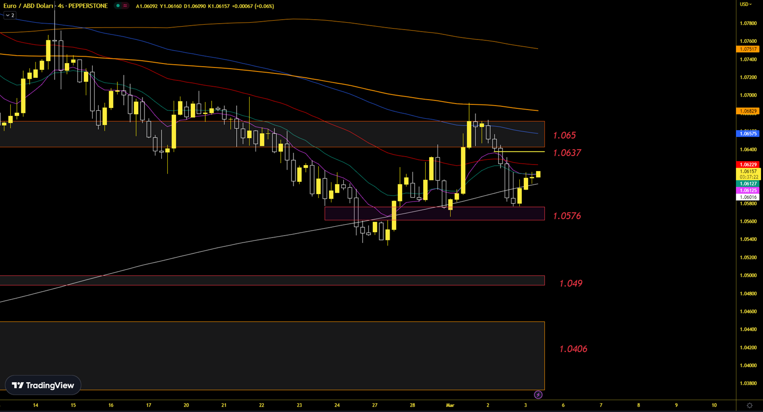 EURUSD The previously determined zones continue to maintain their functionality.The upper limit of the BPR area, which was the previous reversal zone of the price, started an upward movement again.If the 18:00 ISM comes below expectations, it may move the price to an upper zone again. Support: 1.060 - 1.0576 Resistance: 1.0637 - 1.065 - 1.0738