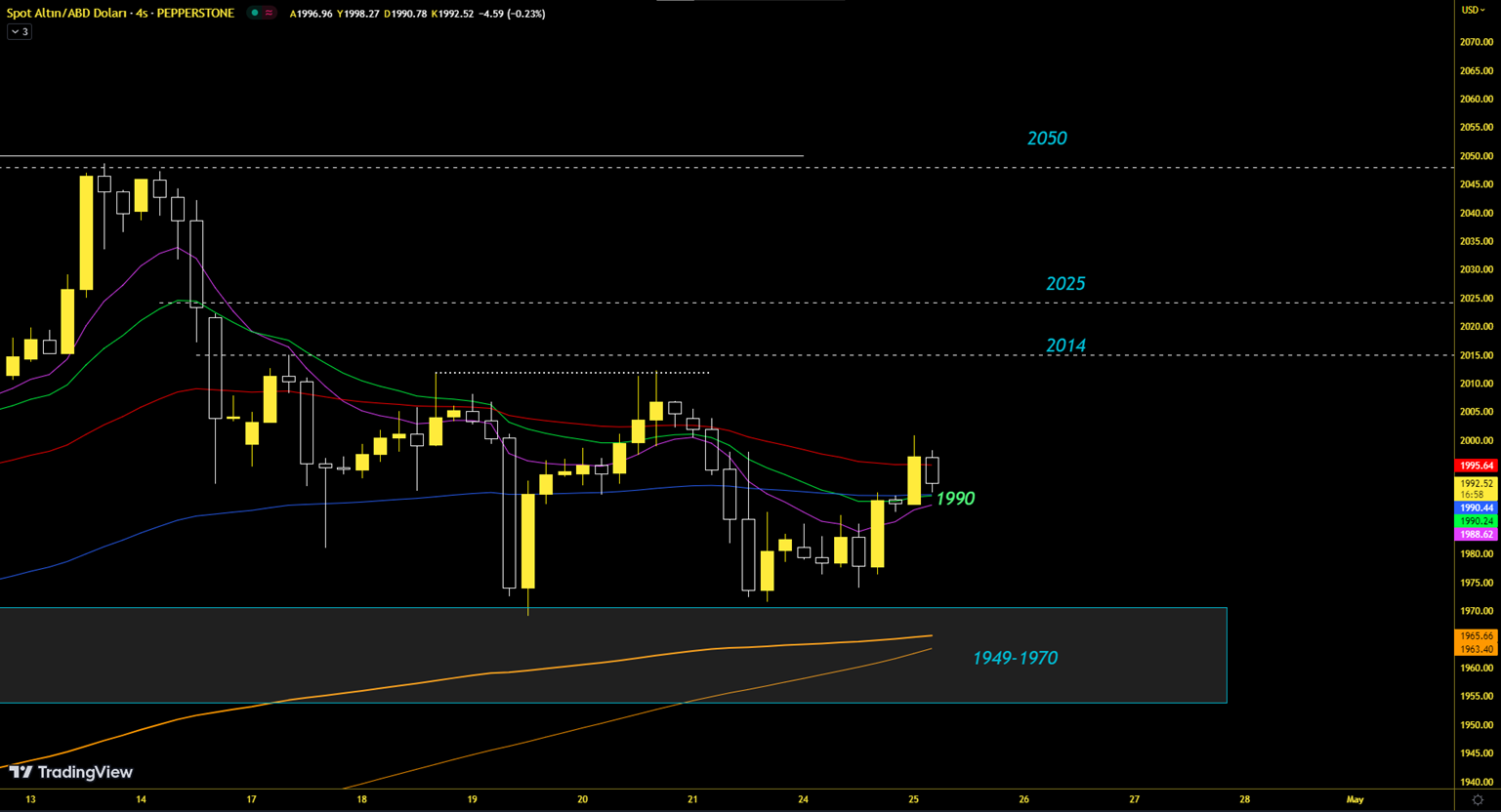 Ounce gold accelerated upwards from the 4-Hour OB upper zone. As long as it closes above 1990, it is likely that we will see upward movements again. 2014 and 2025 can be monitored as sequential targets. Support: 1990 – 1970 - 1949 Resistance: 2014 - 2025