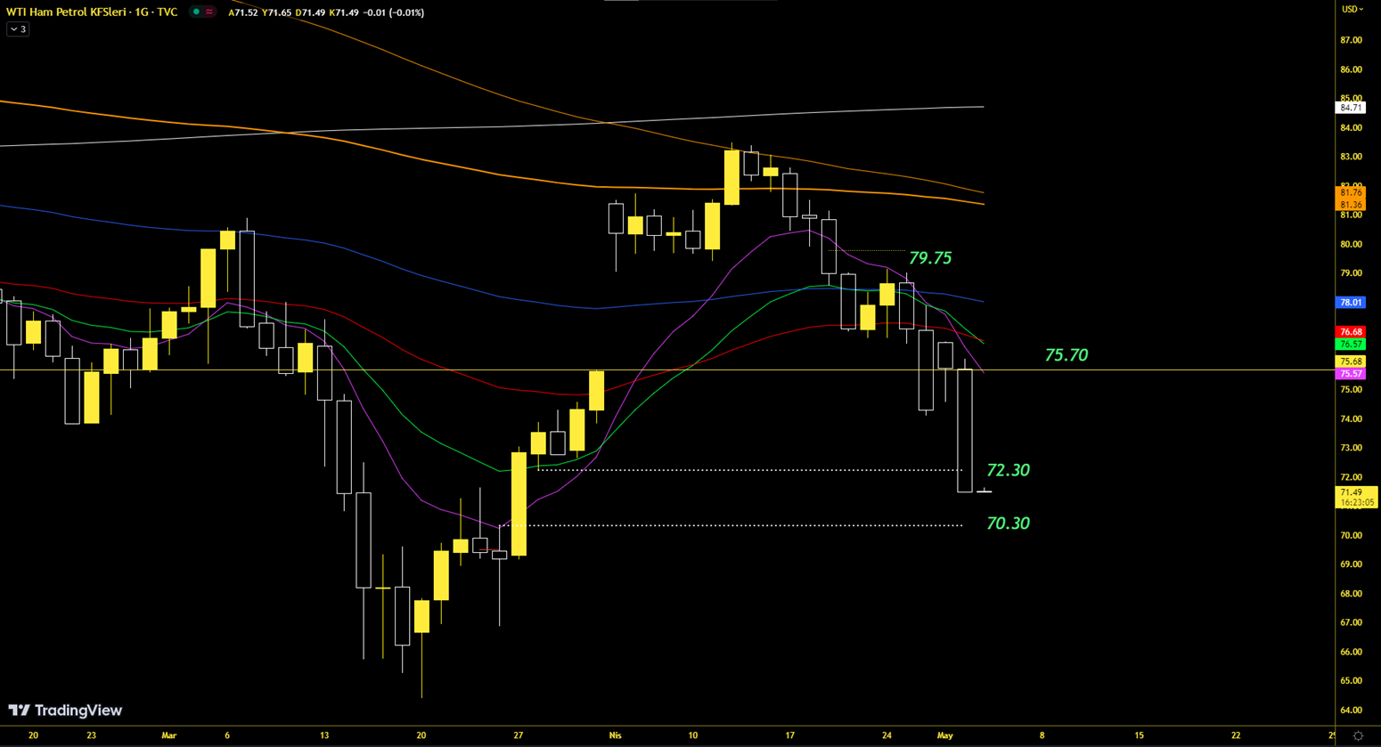 WTI CRUDE Oil gap limit lost 75.70 level. It closed the day with a willing seller candle. We had stated that we see the declines continuing and progressing until the imbalance in the lower region. 72.30 and 70.30 levels were tested. The price entered the region. The target was completed. Support: 72.30 – 70.30 Resistance: 75.70 – 77.00