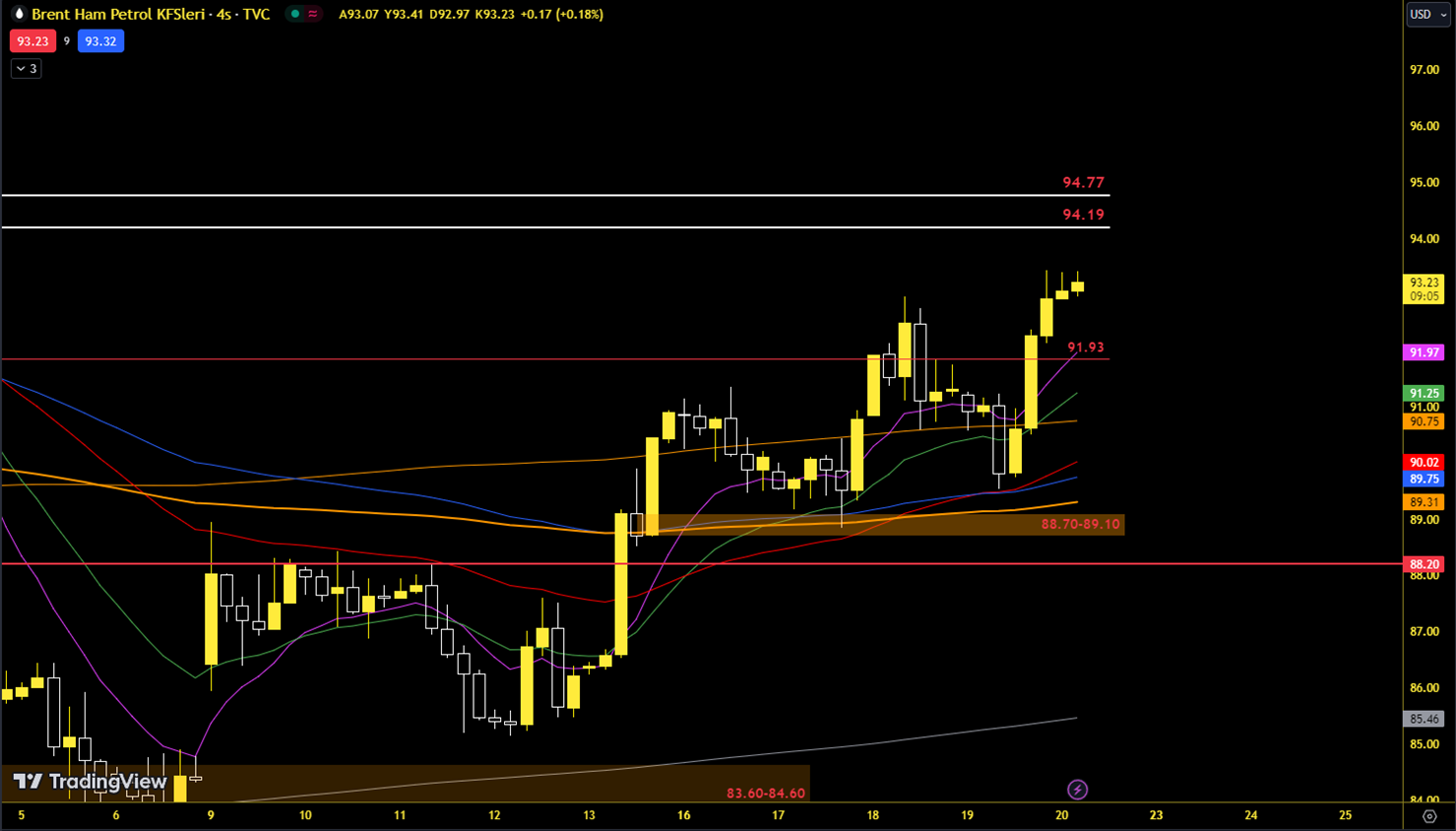 Brent continues its strong trend. The price may want to touch the 4-hour imbalance limits around 94.19 and 94.77. Our near-term expectation will be in favor of continued increases. Support: 92 – 90.80 Resistance: 94.19 – 94.77