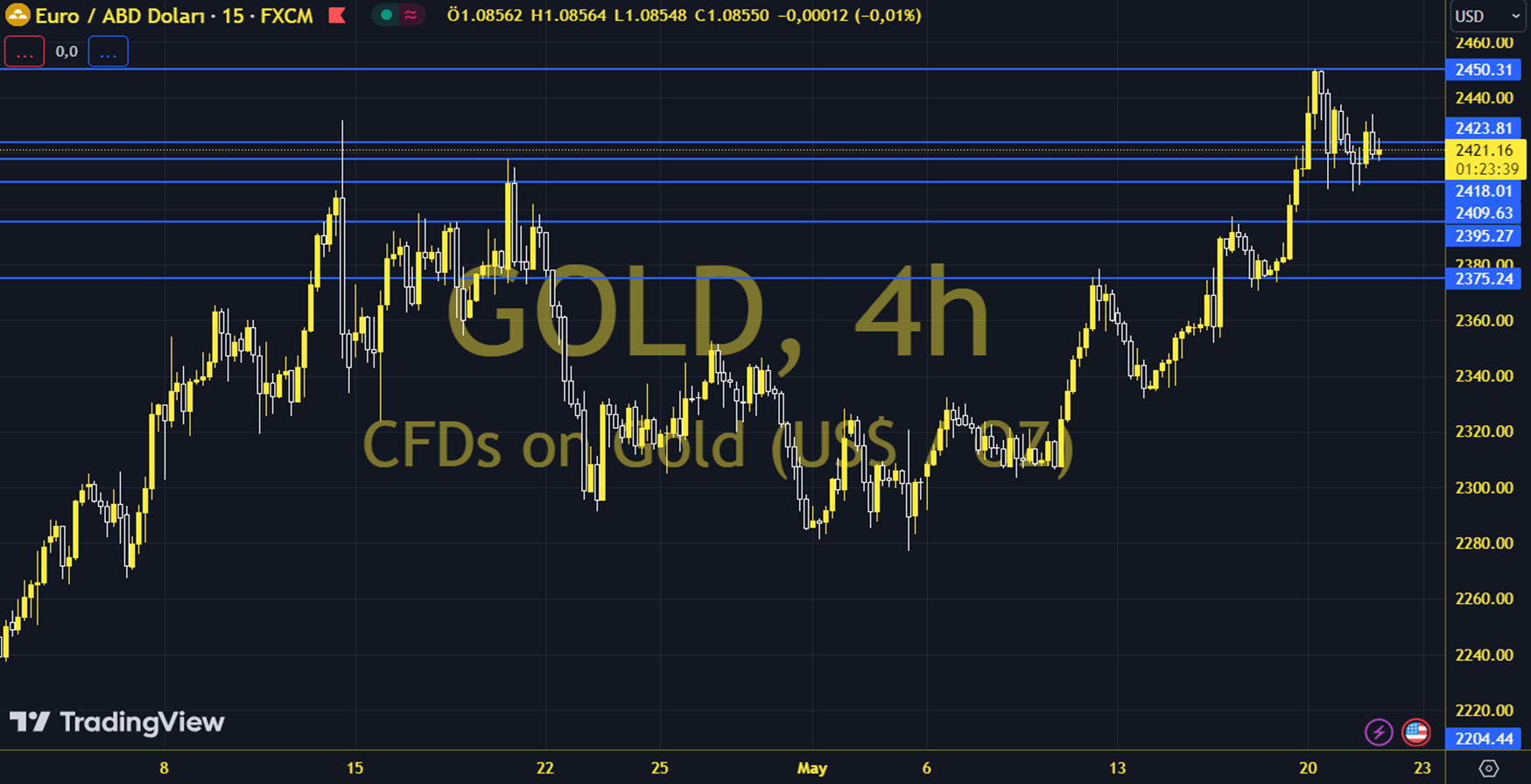 The fact that the Fed members continued to take a cautious stance in their statements and the US 10-year bond yield moved around the 4.42% rate allowed the ounce of gold to see some pressure. For the precious metal, which started the day at 2420 and traded around the 2415 level while the analysis was being prepared; current home sales and FOMC meeting minutes can be followed during the day. The daily loss for the ounce of gold, which closed at 2,416.12 on the previous trading day, was 0.2%. The upward movement observed in the US bond interest rates is pressuring the ounce of gold downward. The RSI indicator for the ounce of gold, which is above its 20-day moving average, is at 64.71, while its momentum is at 103.97. The 2,418.36 level can be followed in intraday upward movements. If this level is exceeded, the 2,424.33, 2,432.53 and 2,438.49 resistances may become important. In case of possible pullbacks, 2,410.16, 2,404.19 and 2,395.99 will be monitored as support levels. Support: 2410 - 2404 Resistance: 2424 - 2432