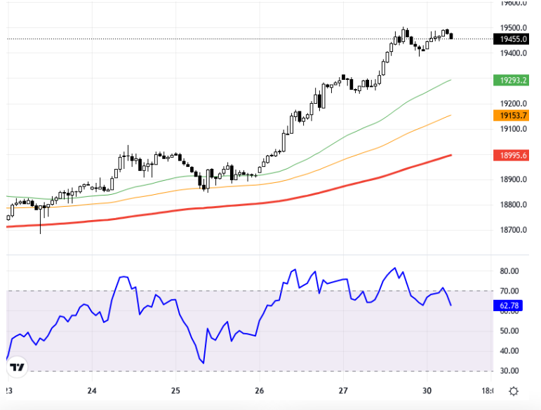 Various macroeconomic data from China, Japan, and Europe, along with uncertainties regarding central banks' interest rate policies, may affect the performance of the DAX 40 index. In China, PMI data exceeding expectations, political developments in Japan, and the downward trend of inflation in Germany are among the factors to be closely monitored in the markets. It is expected that the policies to be followed by the ECB and the Fed in their upcoming meetings will be decisive on stock indices. Today, Germany's CPI data and the speeches by ECB and Fed officials could have direct effects on the DAX 40. In technical analysis, the DAX 40 index is trading in the hourly chart view. Resistance levels are identified at 19660 and 19755, while in downward movements, the 19460 and 19358 levels are monitored as support. The RSI indicator is at 63 and shows a positive trend. As of today, the RSI indicator of DAX 40 has recorded a 0.11% decrease. Currently, the index is trading at the 19454 level. Support:19575 - 19460 - 19358 Resistance:19660 - 19755 - 19838