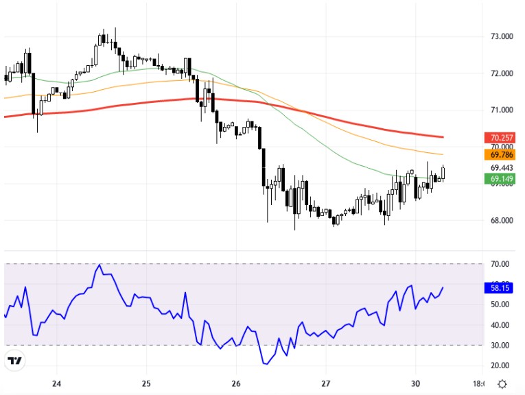Petrol piyasası, Orta Doğu’daki jeopolitik gelişmelerin etkisiyle haftaya temkinli bir başlangıç yaptı. İran ve diğer piyasa dinamikleri, fiyatlamalarda önemli rol oynuyor. Avrupa ve ABD borsalarının seyri gün içinde izlenirken, Çin'de yapılan ekonomik reformlar Asya piyasalarına olumlu yansıyor. Bunun yanında, Japonya'daki siyasi gelişmeler ve ABD tahvil faizlerinin durağan seyri, küresel ekonomik görünümde belirsizlik yaratıyor. Almanya'daki enflasyon oranlarının düşmesi ise Avrupa Merkez Bankası'nın politika adımlarını etkileyebilecek potansiyelde. Teknik olarak, WTIUSD paritesi 1 saatlik grafikte 69.19 seviyesinden işlem görüyor. Yukarı yönlü hareketlerde 69.50 ve 70.00 direnç seviyeleri takip edilmelidir. Aşağı yönlü hareketlerde ise 68.50 ve 68.00 seviyeleri destek olarak izlenebilir. RSI göstergesi 58 seviyesinde olup, pozitif bir eğilim sergiliyor. Diğer yandan, fiyat önceki güne göre %0.45’lik bir artış göstermiştir. Destek:68 - 67.5 - 67 - Direnç:69 - 69.5 - 70 -