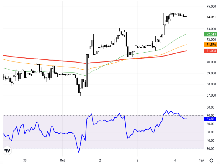 WTI Crude Oil prices are exhibiting a volatile trend due to geopolitical tensions in the Middle East. The tension between Israel and Iran contributes to the upward movement of oil prices. Israel's attacks on Lebanon and potential attacks on Iran increase market anxiety. Employment data to be announced in the US may have indirect effects on oil pricing. If oil remains above the support levels of 72.00 – 72.50 during this period, the upward trend may be maintained. Additionally, potential changes in US interest rate policies could create economic pressure on oil. In technical analysis, WTIUSD is currently trading at the 74.08 level on the hourly chart. There is significant support at the 72.51 level, and potential resistance areas at the 74.50 and 75.00 levels. The RSI indicator is at 65.85, indicating positive momentum in the market. There has been a minimal change of 0.02% compared to the previous day. While maintaining the critical support level of 72.51 is important, the 74.50 and 75.00 levels are the resistance points to watch. Support:73 - 72.5 - 72 - Resistance:74 - 74.5 - 75 -